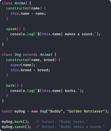 Classes can extend other classes, creating clear inheritance hierarchies. The super keyword is used to call a parent class's constructor.