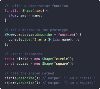 In this example, the Shape constructor's prototype is shared between circle and square instances, reducing memory usage.